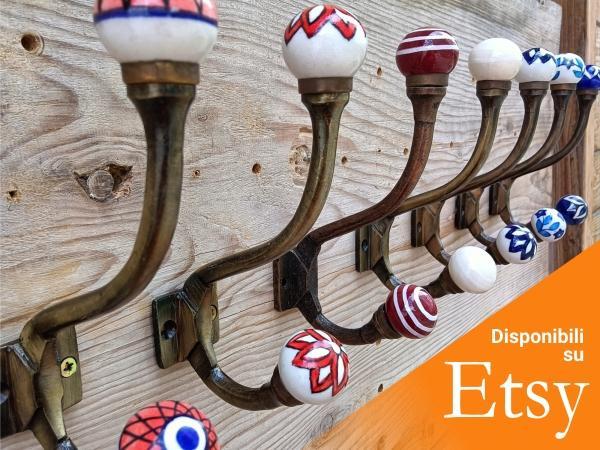 Oltre ai pomelli troverai una serie di Ganci Appendiabiti Murali, con struttura di metallo brunito e pomellini di ceramica.