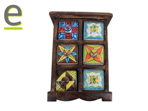 Contenitore per spezie fatto di legno con 6 cassettini di ceramica decorati a mano.